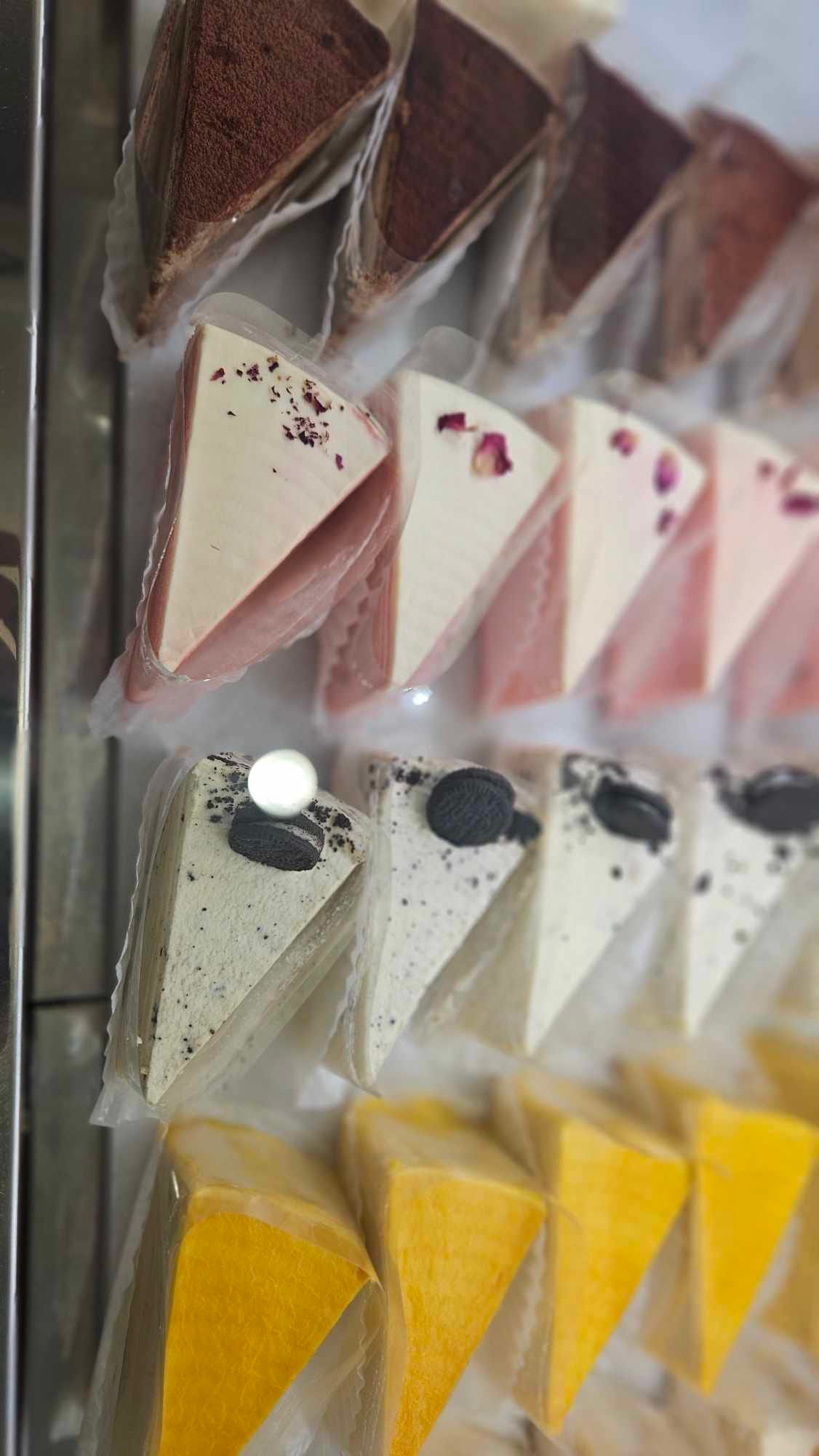 This time I walked past the cheesecakes, with my not-inconsiderably-sized nose in the air, because I had come for some really special stuff. Inside the shop, under glass, looking a little like an edible jewellery display, are rows of triangular cake slices - with a difference. Insead of layers of sponge and cream, Japanese Mille Crêpe cakes are made from multiple layers of thin pancakes, sandwiched together with a delicate cream filling. They seem to come in every colour of the rainbow. Flavours like black sesame and green matcha sit alongside rose, tiramisu and sea salt caramel. Light, not too sweet, but not under sugared either. Sakurado package these cakes beautifully too, making rather super gifts.