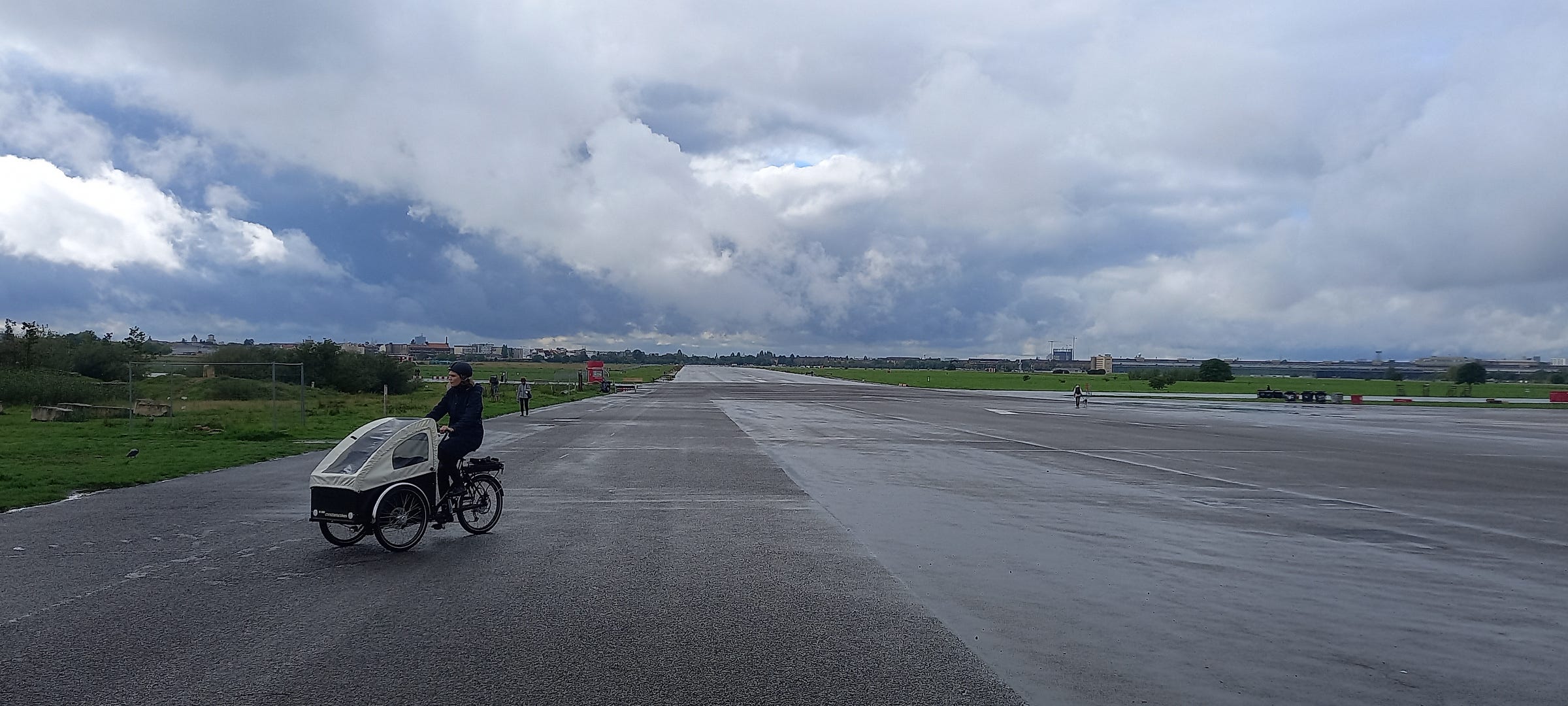 I arrived at a tall fence, enclosing acres of concrete, glistening under a coating of rainwater. The sky was crowded with charcoal clouds; broad flat runways reflected dim light. A woman on a bicycle with a small, covered trailer in front, cycled diagonally across the tracks. As she passed, laughter escaped from under the canopy of the trailer and I could see two young children inside.
